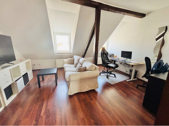 This modern and very well-maintained 2-room apartment is located in a central area of Wiesbaden. It is situated on the 4th floor of a listed multi-family building and gains significant added value from its location on the top floor, offering additional private attic space – THE HIGHLIGHT! This attic is accessible exclusively through the apartment. The hallway leads you to the right into the kitchen, which is equipped with a fitted kitchen including built-in appliances and a dining area. Opposite is the cozy living room, which is particularly highlighted by exposed roof beams. Thanks to the efficient layout, there is also enough...