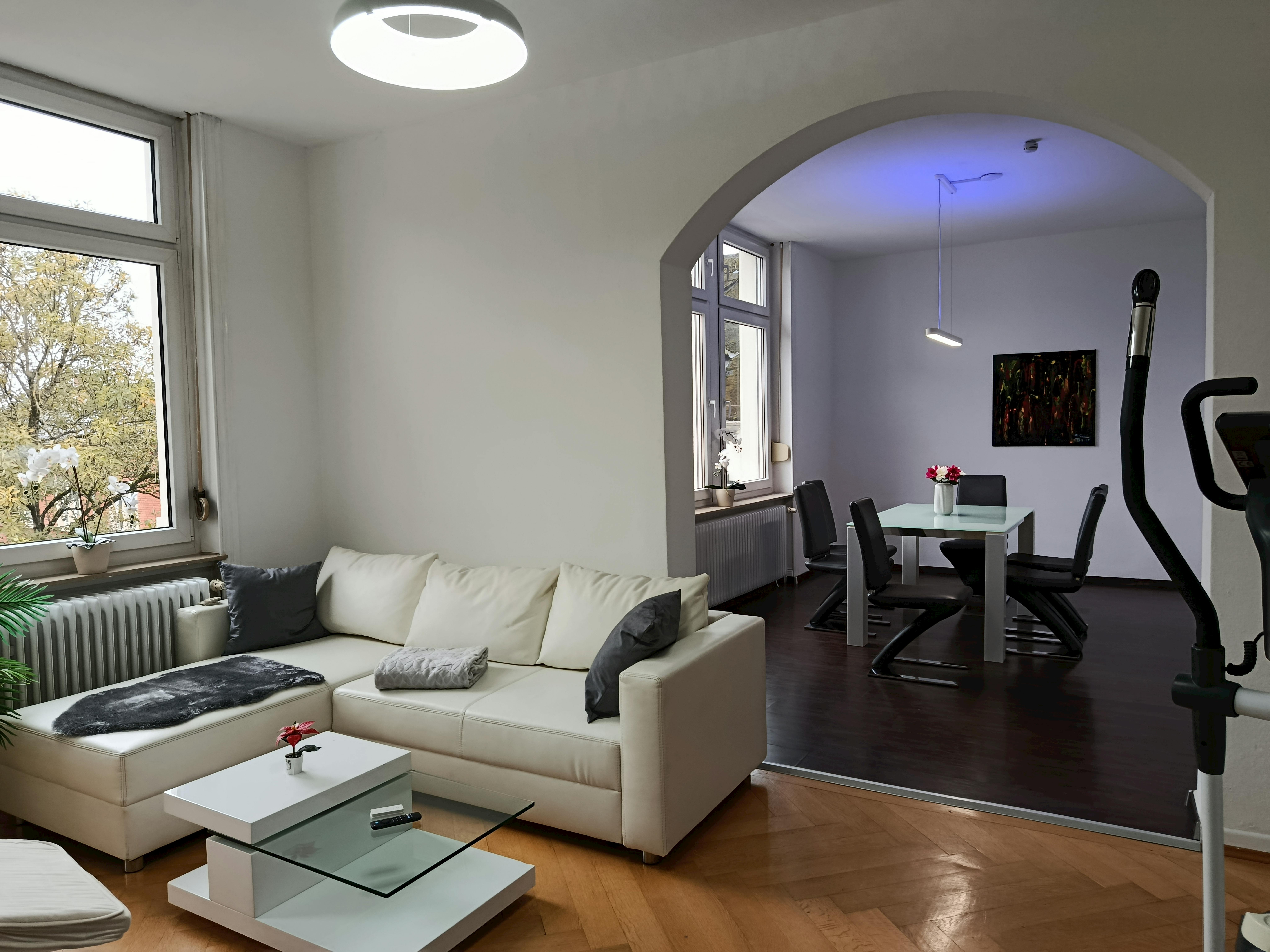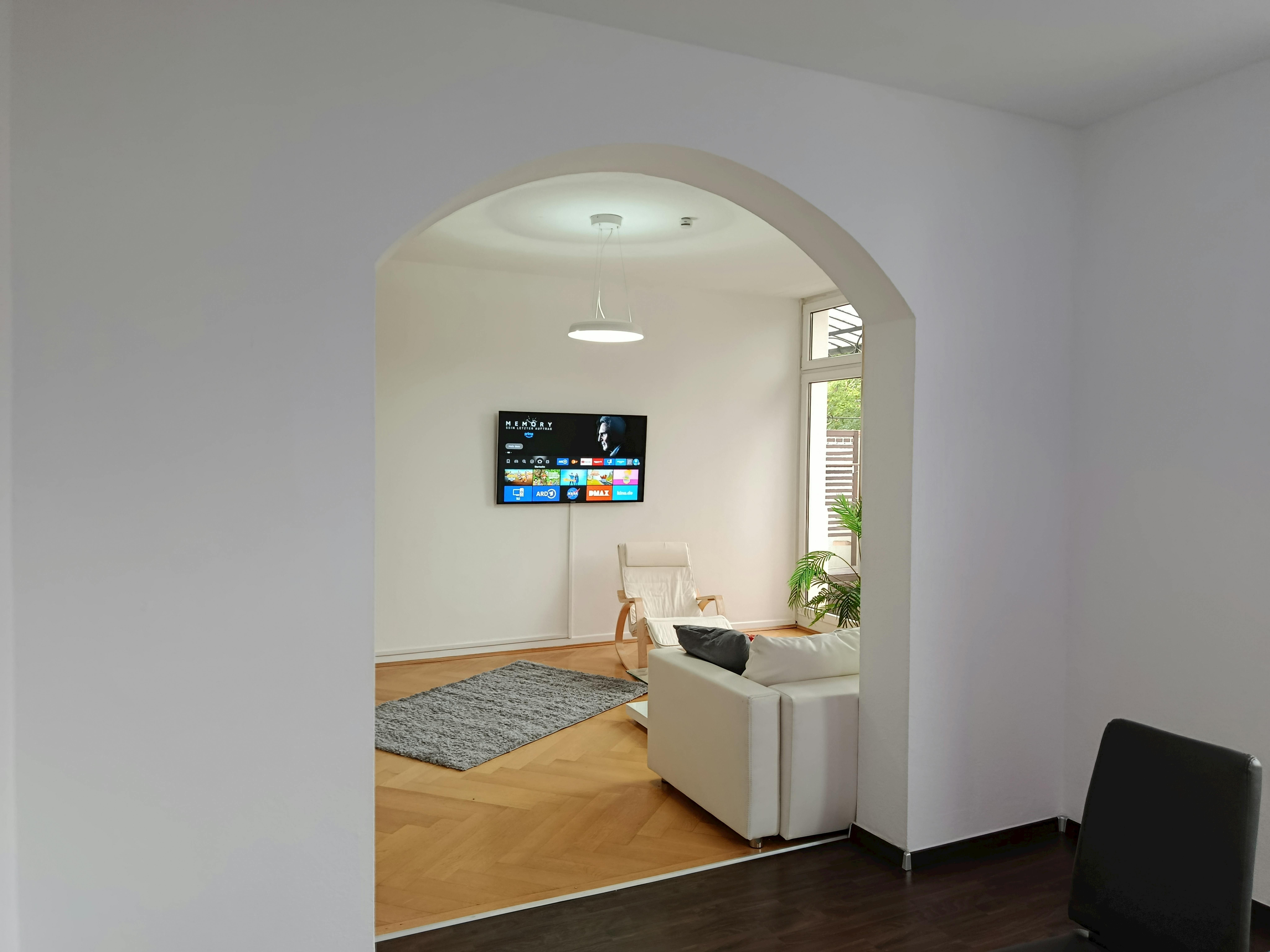 Historic building from 1900 with modern vibes in the heart of Wiesbaden. This is a 2nd-floor apartment with 83 sqm. The bathroom has a bathtub with a shower curtain and a rainfall shower. The balcony is divided by a glass privacy wall. The kitchen is fully equipped and includes a washer-dryer, dishwasher, oven, and microwave. In the bedroom there is a 180x200 cm box spring bed (bit smaller than US king size) and a large wardrobe. Additionally, the living room has a sofa bed (sleeping area about 2.13cm x 1.35cm). Large televisions with Fire TV Stick are in the...